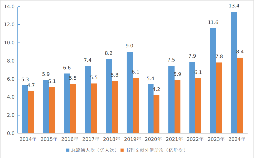 图2:2014—2024年全国公共图书馆总流通人次及书刊外借册次