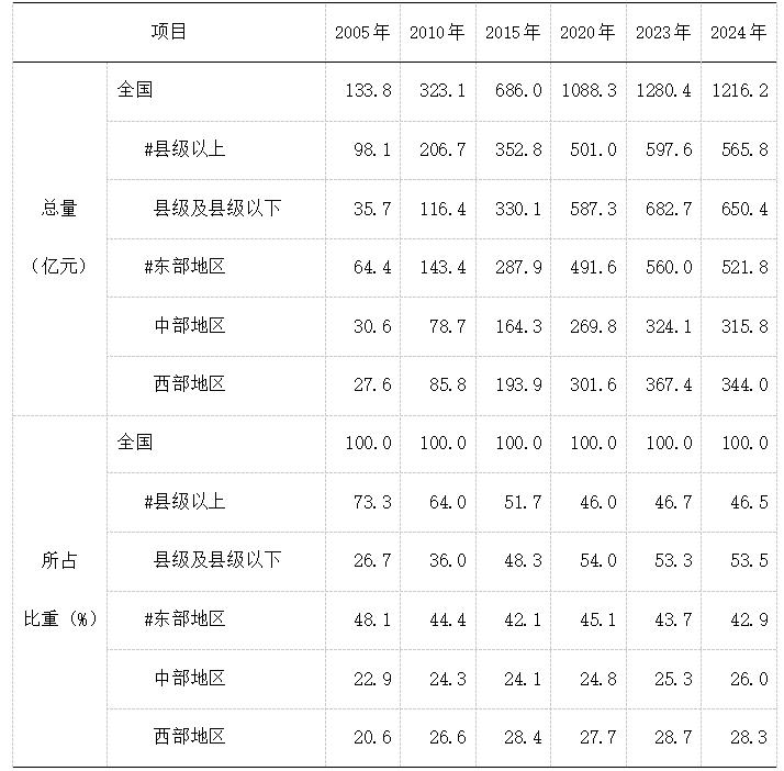全国文化和旅游事业费中,县级以上文化和旅游事业费565.8亿元,占46.5%,比重比上年下降了0.1个百分点;县级及县级以下文化和旅游事业费650.4亿元,占53.5%,比重比上年提升了0.1个百分点。东部地区文化和旅游事业费521.8亿元,占42.9%,比重比上年下降了0.8个百分点。中部地区文化和旅游事业费315.8亿元,占26%,比重比上年提高了0.7个百分点。西部地区文化和旅游事业费344亿元,占28.3%,比重比上年下降了0.4个百分点。
