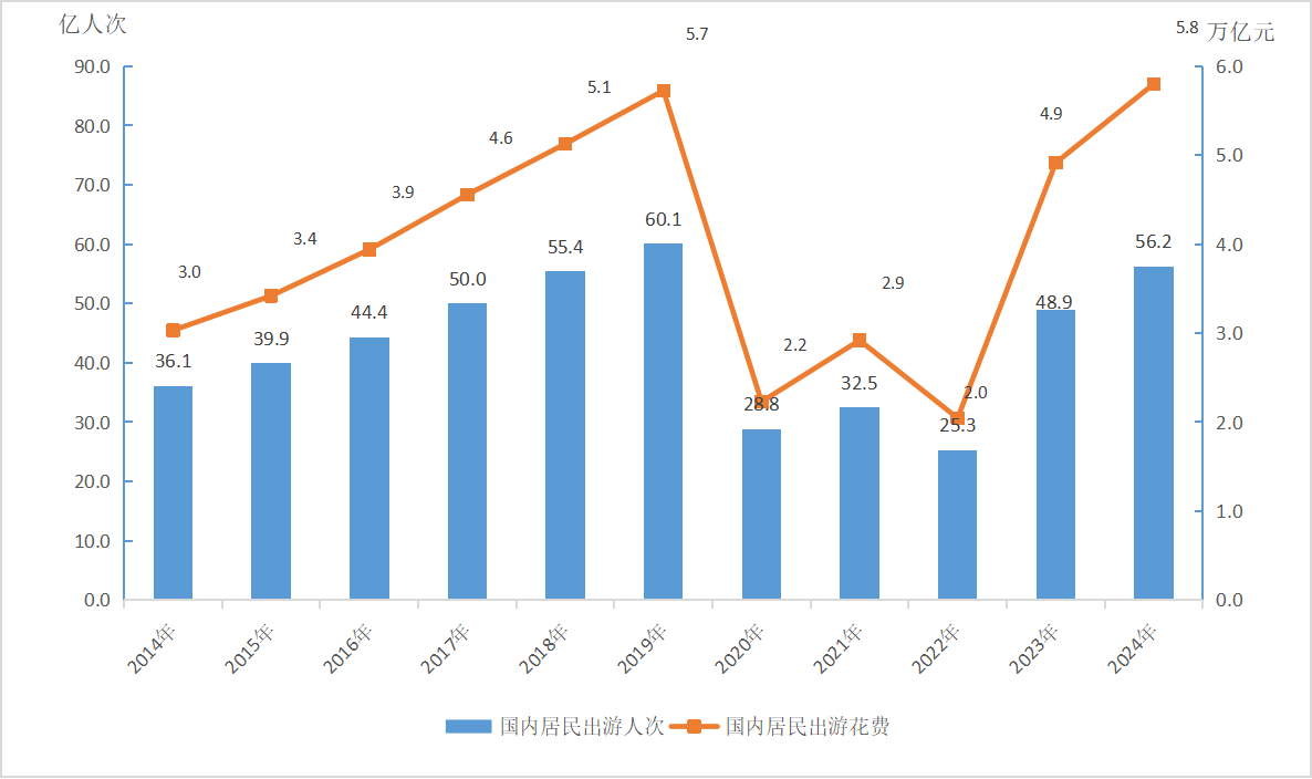 2024年,国内居民出游56.2亿人次,同比增长14.8%。其中,城镇居民国内出游43.7亿人次,同比增长16.3%;农村居民国内出游12.5亿人次,同比增长9.9%。国内居民出游总花费5.8万亿元,同比增长17.1%。其中,城镇居民出游花费4.9万亿元,同比增长18.0%;农村居民出游花费0.8万亿元,同比增长12.2%。