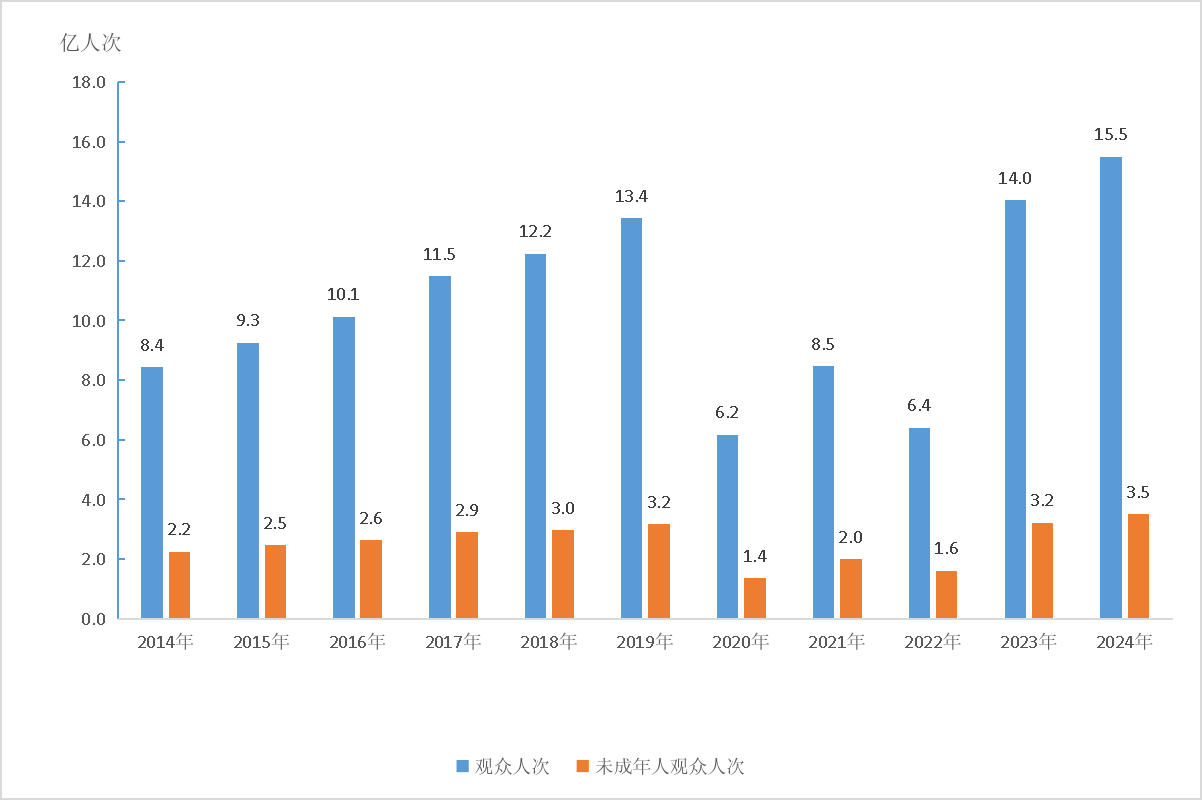 图4:2014—2024年全国文物机构接待观众人次及未成年人观众人次